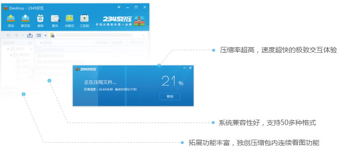 高效專業(yè),值得信賴2345好壓是國內(nèi)自主研發(fā)的免費壓縮軟件。無論在速度,易用性還是安全性方面均表現(xiàn)出色,完美兼容包括Win8在內(nèi)的所有WINDOWS系統(tǒng),完美支持RAR5、ZIPX和ALZ格式的解壓,能夠壓縮LZH格式,支持格式多達51種。 了解更多