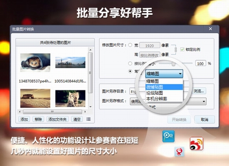一鍵添加文件夾,無需重復(fù)逐個(gè)選取。具備多種圖片格式轉(zhuǎn)換方式,還可智能設(shè)為微博貼圖、論壇貼圖等多種常用尺寸。