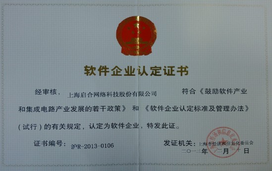 2013年02月10日,2345.com經(jīng)上海市經(jīng)濟(jì)和信息化委員會(huì)正式認(rèn)定為“雙軟企業(yè)”,獲得了由上海市經(jīng)濟(jì)和信息化委員會(huì)正式頒發(fā)的“軟件企業(yè)認(rèn)定證書”(證書編號(hào):滬R-2013-0106)。