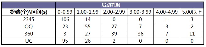 從啟動耗時來看,2345手機瀏覽器的啟動耗時區(qū)間大致在0-1.99秒,平均啟動耗時略遜于UC,但遠遠優(yōu)于QQ和360的啟動耗時。而且測試表現(xiàn),2345和UC的啟動耗時在各機型上表現(xiàn)波動不大,非常穩(wěn)定。
