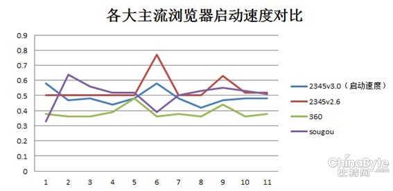 對比先前2.6版本,3.0的版本在啟動速度上有較大提升,啟動速度普遍比2.6版本更快,提高了10%左右。另外,2345瀏覽器3.0版本的啟動速度也略快于搜狗瀏覽器,平均速度則比360慢0.1秒。