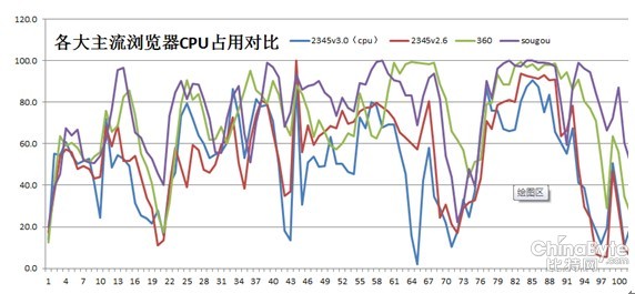 經(jīng)過測試,在CPU占用方面,2345瀏覽器3.0版本占用量最少,其次為2.6版本,搜狗瀏覽器和360瀏覽器占用量基本持平。整體來看,2345瀏覽器2個版本的CPU占用量均小于其他兩款瀏覽器,能讓電腦保持穩(wěn)定運行及快速處理。