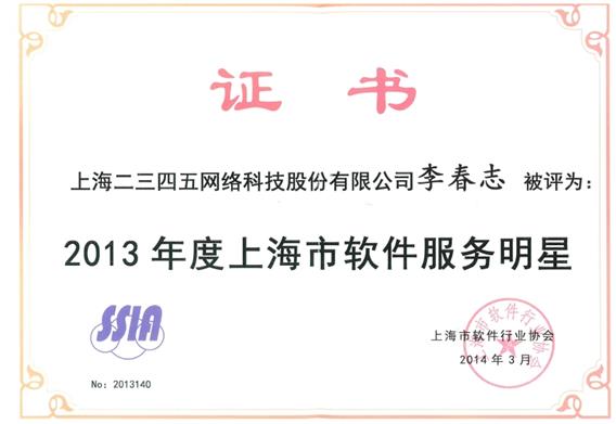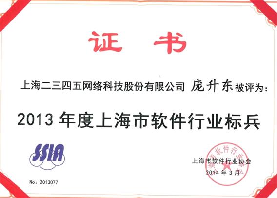 2014年3月26日下午,上海市軟件行業(yè)協(xié)會2014年工作年會暨“上海市軟件行業(yè)標(biāo)兵&軟件行業(yè)服務(wù)明星”評選活動頒獎典禮在上海市經(jīng)濟(jì)管理干部學(xué)院禮堂舉行。上海市經(jīng)信委、科委、發(fā)改委、商務(wù)委等相關(guān)部門負(fù)責(zé)人,相關(guān)產(chǎn)業(yè)園區(qū)(基地)、行業(yè)協(xié)會、軟件企業(yè)負(fù)責(zé)人及十余家媒體記者,約300人到會。本次評選活動中二三四五董事長龐升東獲得軟件行業(yè)標(biāo)兵稱號,二三四五軟件研發(fā)中心李春志獲得軟件服務(wù)明星稱號。