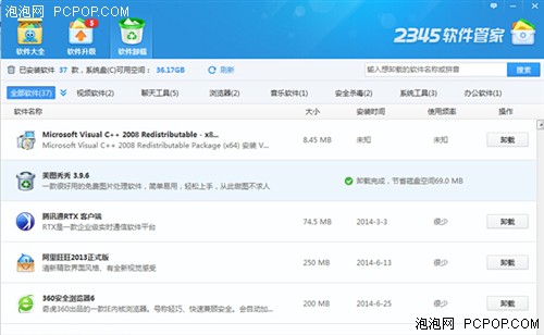 筆者了解到,2345軟件管家包含3000余款正版軟件,且在技術(shù)層面對設(shè)置了流氓捆綁的軟件進(jìn)行了修正,用戶可以放心選擇安裝;同時,2345軟件管家可智能識別電腦中已經(jīng)安裝的軟件,用戶只需輕輕點擊,便可完成卸載,對令用戶苦惱的卸載殘留更是提供了“強(qiáng)力清掃”功能,使卸載真正一步到位。