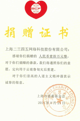 近日,上海二三四五網(wǎng)絡(luò)科技股份有限公司(簡稱“2345網(wǎng)絡(luò)”)宣布經(jīng)由上海慈善基金會--2345愛心公益專項基金捐獻(xiàn)10萬元整用于云南魯?shù)榈卣馂?zāi)區(qū)的災(zāi)后重建。