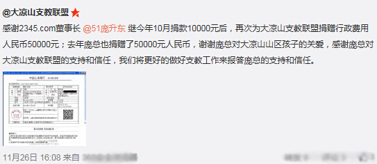 日前,公益微博賬號“@大涼山支教聯(lián)盟”發(fā)布圖文信息對2345.com董事長龐升東捐贈善款表示感謝。博文中更是提及,龐升東以連續(xù)兩年多次對該機構(gòu)進行扶助。細心網(wǎng)友注意到,同一時期,龐升東的名字也在其他十余家支教組織的捐款公示中出現(xiàn)。據(jù)不完全統(tǒng)計,龐升東近期累計資助12家支教組織,善款總額高達83萬元。