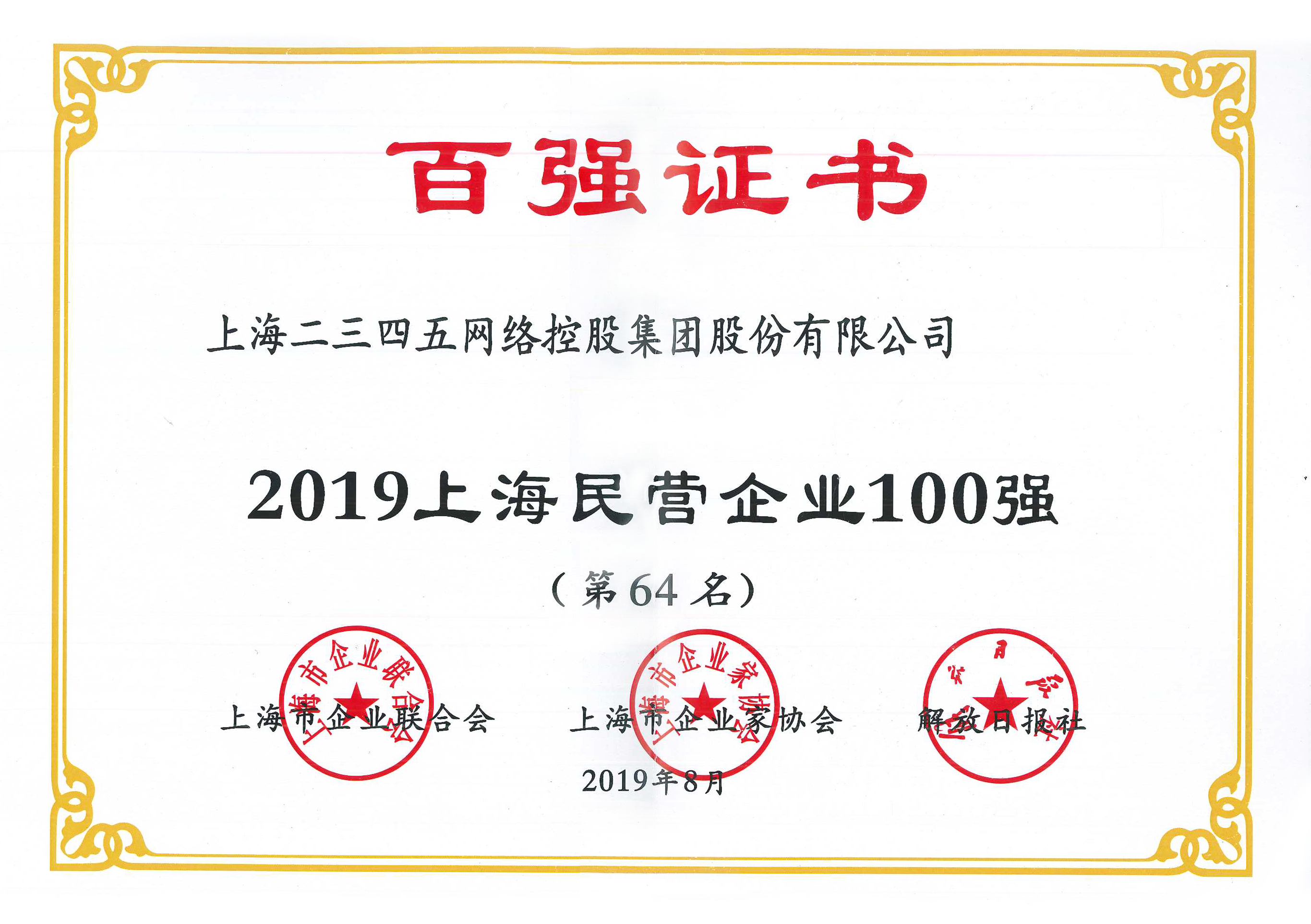 8月19日,上海市企業(yè)聯(lián)合會(huì)、上海市企業(yè)家協(xié)會(huì)、上海市經(jīng)濟(jì)團(tuán)體聯(lián)合會(huì)聯(lián)合發(fā)布2019上海百強(qiáng)企業(yè)榜單,上海二三四五網(wǎng)絡(luò)控股集團(tuán)股份有限公司(簡稱“二三四五”,股票代碼002195)再次登榜,榮居上海民營企業(yè)百強(qiáng)排行64名,較上年上升5名。二三四五還同時(shí)蟬聯(lián)上海服務(wù)業(yè)企業(yè)100強(qiáng)和上海民營服務(wù)業(yè)企業(yè)100強(qiáng)。