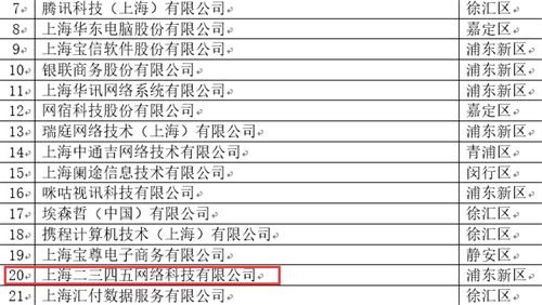 11月20日,由上海市經(jīng)濟(jì)和信息化委員會(huì)評選頒布的“2019上海軟件和信息技術(shù)服務(wù)業(yè)百強(qiáng)”和“2019上海軟件和信息技術(shù)服務(wù)業(yè)高成長百家”企業(yè)名單公布,二三四五旗下子公司上海二三四五網(wǎng)絡(luò)科技有限公司榮居“2019上海軟件和信息技術(shù)服務(wù)業(yè)百強(qiáng)”第20名、上海洪昇智能科技有限公司榮居“2019上海軟件和信息技術(shù)服務(wù)業(yè)高成長百家”第21名。