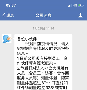 1月21日,也就是春節(jié)假期前三天,二三四五公司負(fù)責(zé)人親自進(jìn)行廣播講話,強(qiáng)調(diào)疫情嚴(yán)重性,告知所有員工務(wù)必重視。