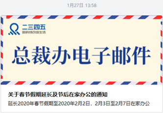 1月27日,2點(diǎn)27分,國(guó)務(wù)院辦公廳發(fā)布關(guān)于春節(jié)假期延長(zhǎng)的通知。當(dāng)天13點(diǎn)58分,二三四五發(fā)布《關(guān)于春節(jié)假期延長(zhǎng)及節(jié)后在家辦公的通知》全員郵件,宣布延長(zhǎng)2020年春節(jié)假期至2020年2月2日,并宣布2月3日至2月7日期間,二三四五小伙伴居家遠(yuǎn)程辦公。