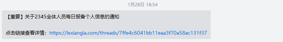 于是1月25日,農(nóng)歷大年初一,二三四五再次發(fā)布通知,提醒全員加強(qiáng)健康報(bào)備以及其他防疫注意事項(xiàng)。
