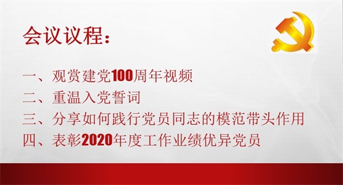 會(huì)議開始,黨員們觀看了建黨100周年視頻,跟著視頻回顧了黨建立百年以來的光輝歷程,不忘歷史,展望未來。之后,在黃國敏書記的帶領(lǐng)下,所有參會(huì)黨員重溫了入黨誓詞,再一次明確了自己的責(zé)任和使命,堅(jiān)定了作為共產(chǎn)黨員的理想信念。