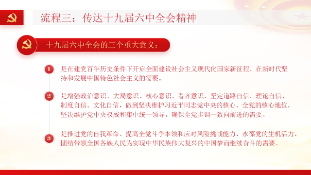 會(huì)議流程三,向各位黨員傳達(dá)黨的十九屆六中全會(huì)精神,強(qiáng)調(diào)十九屆六中全會(huì)召開(kāi)的重大意義。號(hào)召各位黨員貫徹并落實(shí)“兩個(gè)維護(hù)”的重要內(nèi)容,即“堅(jiān)決維護(hù)習(xí)近平同志黨中央的核心、全黨的核心地位,堅(jiān)決維護(hù)黨中央權(quán)威和集中統(tǒng)一領(lǐng)導(dǎo)”。
